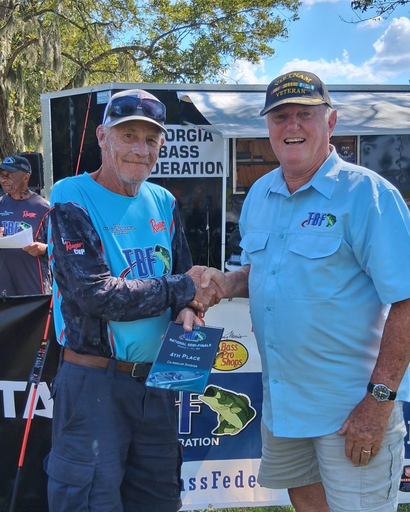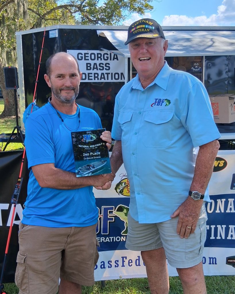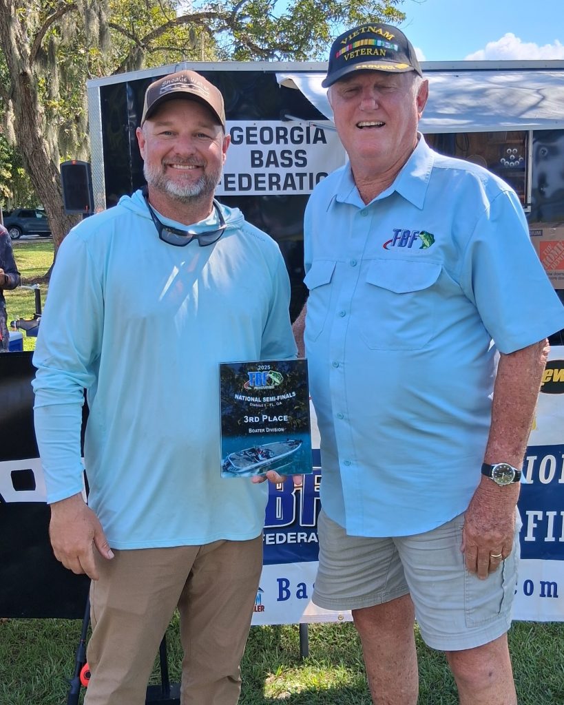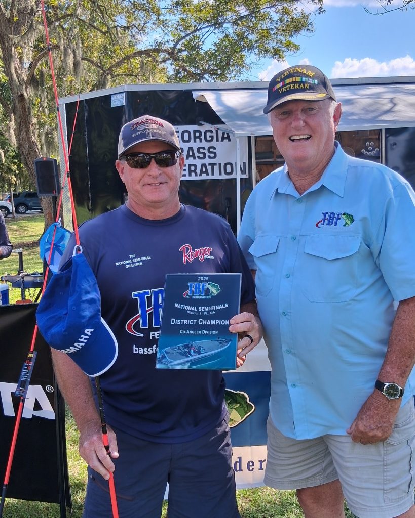 Overall winners for the 2025 District 1 TBF GA-FL National Semi Finals were Jesse Tacoronte of the Florida Bass Federation with eight (8) bass weighing 21 pounds 8 ounces on the Boater’s side and Gene Willis of the Georgia Bass Federation with five (5) bass weighing 11 pounds 11 ounces on the Co-angler’s side.
